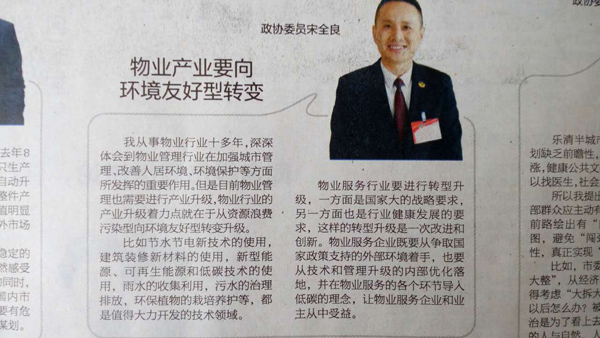 除此之外,兩會期間樂清日報推出關于經濟轉型專版兩會訪談的專版,作為特邀委員的宋總對于經濟轉型過程中物業行業升級的著力點給出了自己獨到的見解:“我從事物業行政行業十多年,深深體會到物業管理行業在加強城市管理、改善人居環境、環境保護等方面所發揮的重要作用。但是目前物業管理也需要進行產業升級,物業行業的產業升級著力點就在于從資源浪費污染型向環境友好型轉變升級。
